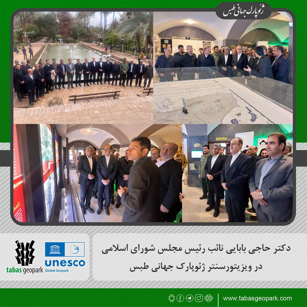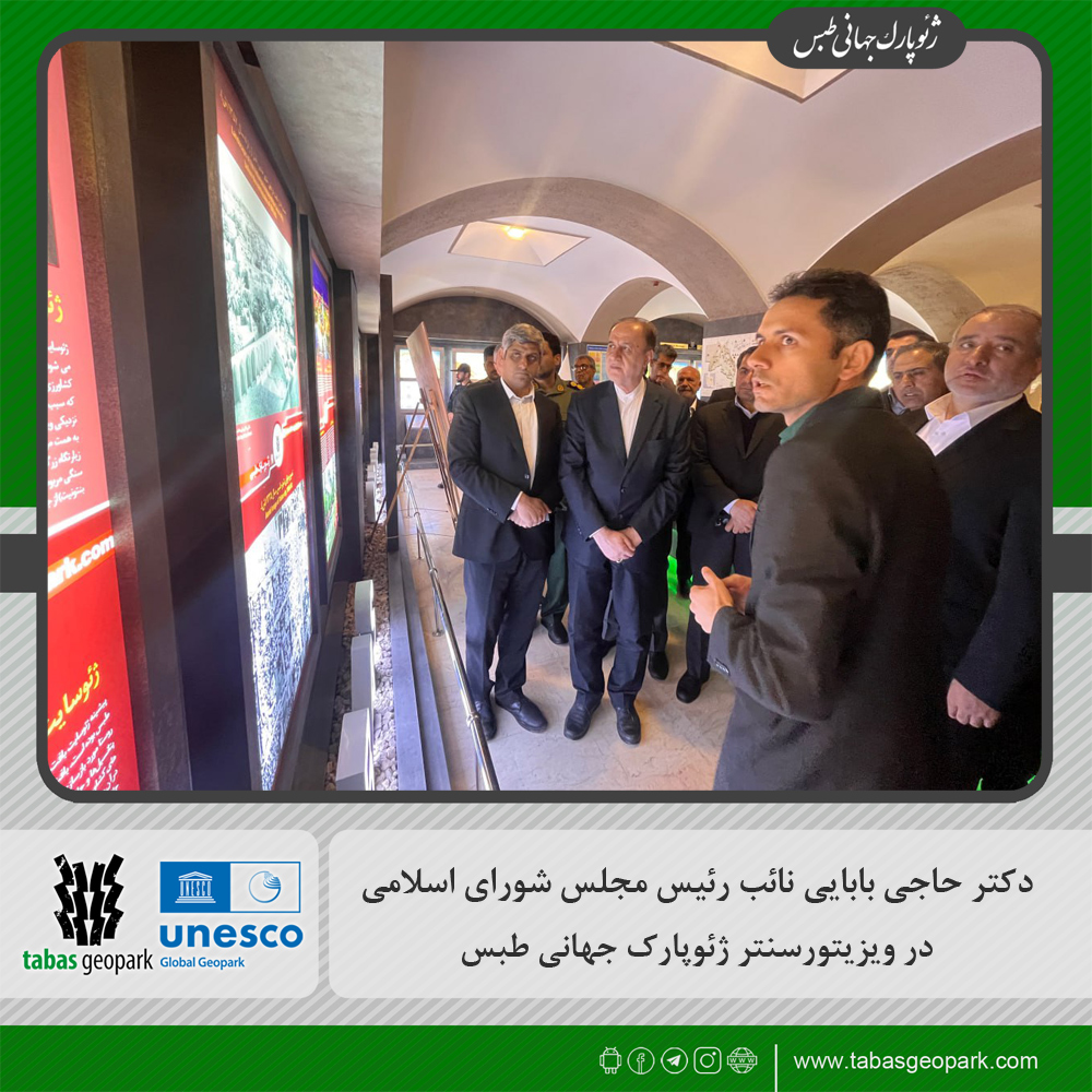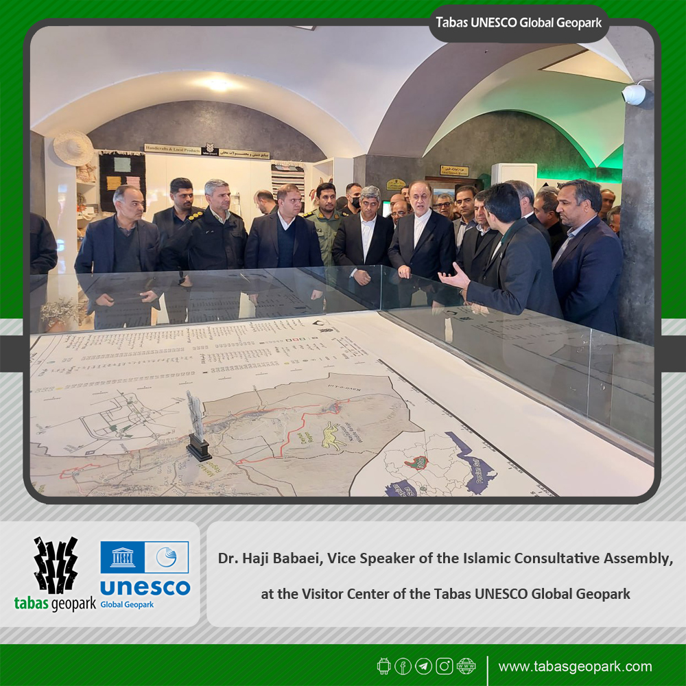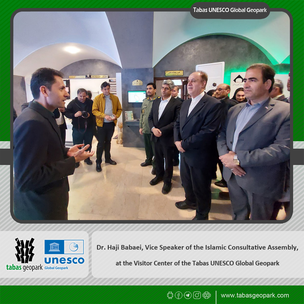 🔷 During a visit to Tabas County, Dr. Hajibabaei, Vice Speaker of the Islamic Consultative Assembly, accompanied by Engineer Nasiri, Member of Parliament representing Tabas; Engineer Hashemi, Governor of South Khorasan; and Dr. Ashrafian, Deputy Governor and Special Governor of the County, along with other provincial and county officials, visited the Visitor Center of the Tabas UNESCO Global Geopark to review the capacities and programs of this complex.